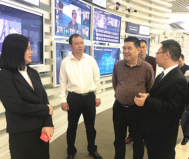 城投集團(tuán)黨委副書記、總經(jīng)理蒙金昌(右二),黨委副書記梁輝露(左二)在華為技術(shù)有限公司深圳總部展廳參觀學(xué)習(xí)